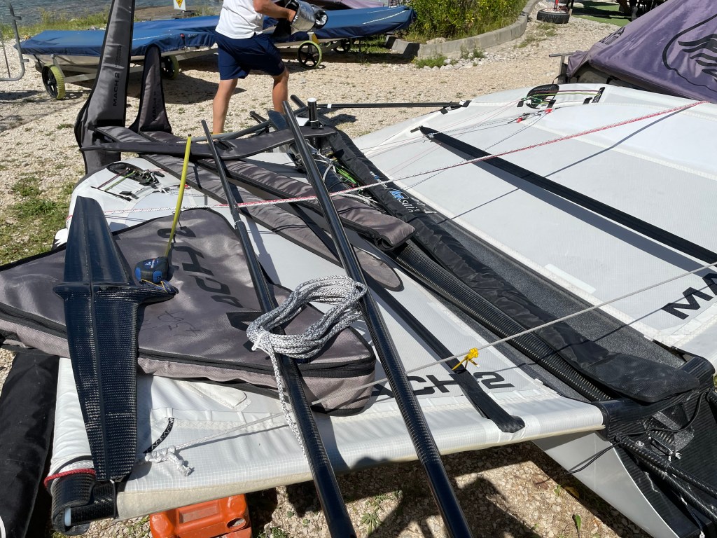 Next up, measuring all the boat parts and entering them into an online database. This took a while: hull, sail, main foil (vert + horiz), rudder foil (vert + horiz), mast, boom. All measured using the cool little Measure app on my iPhone. (Have you ever tried it; pretty cool, you point the camera at one end of something, click +, point at the other end of the thing, click + again, and poof you have the length. Magic.)