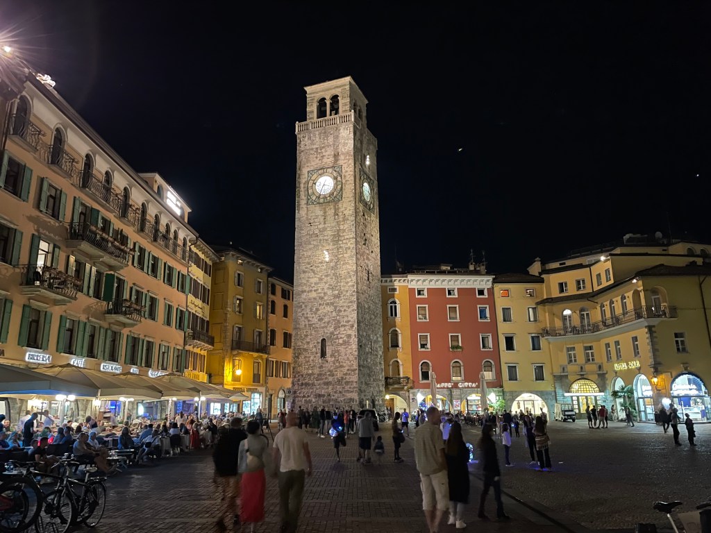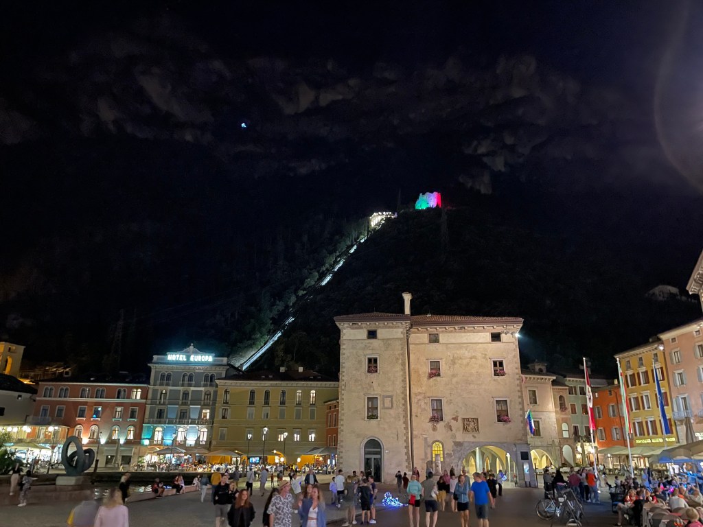 A little more food blogging. Last night I voyaged to Riva de Garda, a town at the North end of the lake, and a beautiful one at that. It features an “old town” right down on the water, and I found the coolest piazza for dinner. La cena era Cotoletta alla Milanese aka Wiener Schnitzel con Amarone della Valpolicella – molto deliziosa.
