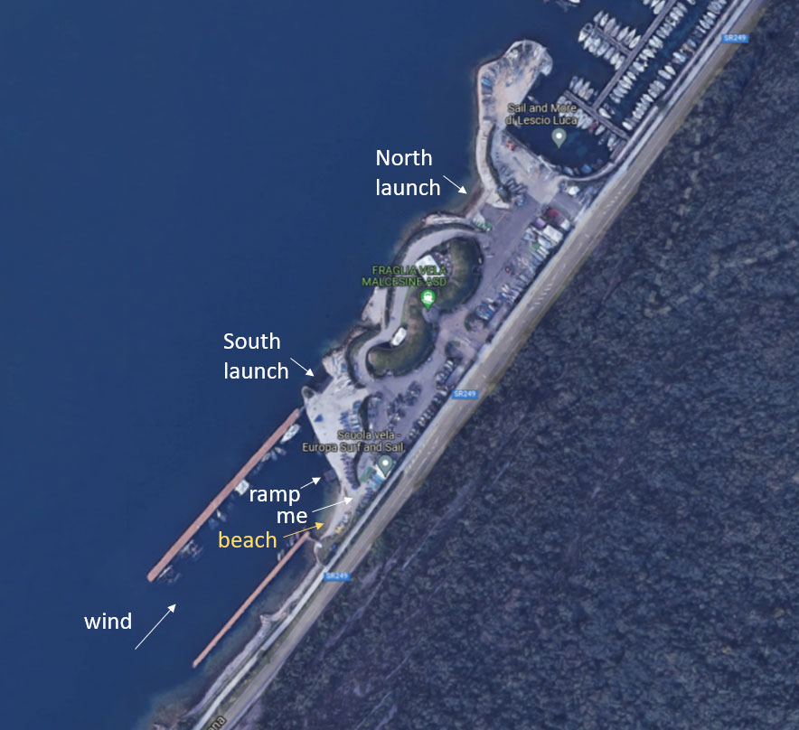 Here’s the aerial map from yesterday. But today instead of launching from the “ramp”, I rolled my boat down to the “beach”. This did three things: 1) closer to the exit and better angle to get started, 2) directly upwind of “me” (rolling a Moth around on its cart with the sail up, you can only go into or away from the wind, otherwise it will capsize) 3) less traffic from other boats. And indeed it worked, I was able to launch successfully. In fact I did it four times, more on this below.