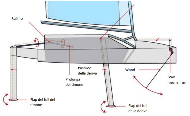 At the bottom of the rudder is a smaller foil which doesn’t have a trim tab. However the angle of the foil can be adjusted. (rudder is “timone”) The entire rudder can be tilted slightly forward, increasing the angle of attack, or sightly back, decreasing the angle. The tilt is controlled through a clever mechanism by rotating the tiller extension. (“prolunga del timone”) Rotate the extension clockwise (looking toward the bow) it tilts the rudder back, lowering the stern and raising the bow. Rotate counter-clockwise and it tilts the rudder forward, raising the stern and lowering the bow. Since the tiller is always in your hand, you can always adjust the attitude of the boat. You may not be surprised to hear: this matters!